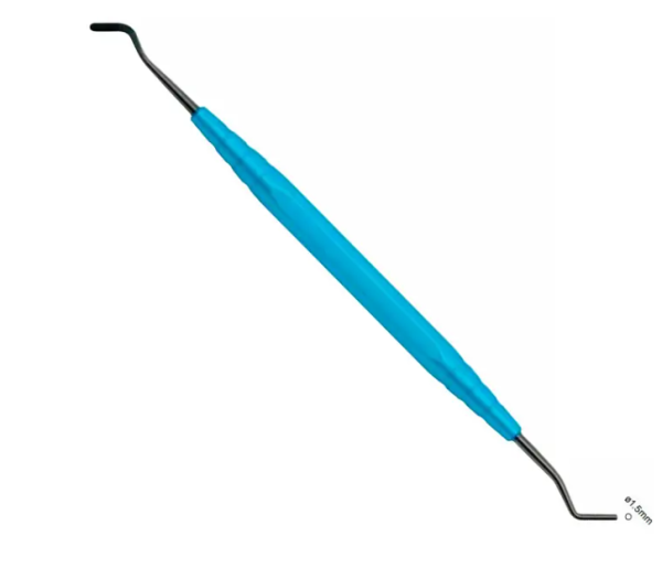 - Форма: Двостороння. Гладилка має дві робочі поверхні з різними формами, що робить її універсальною та зручною для роботи в різних зонах рота.